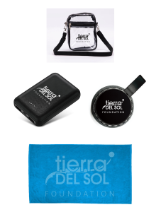 Prizes for fundraisers include clear stadium bags, portable chargers, bluetooth speakers, and beach towels.