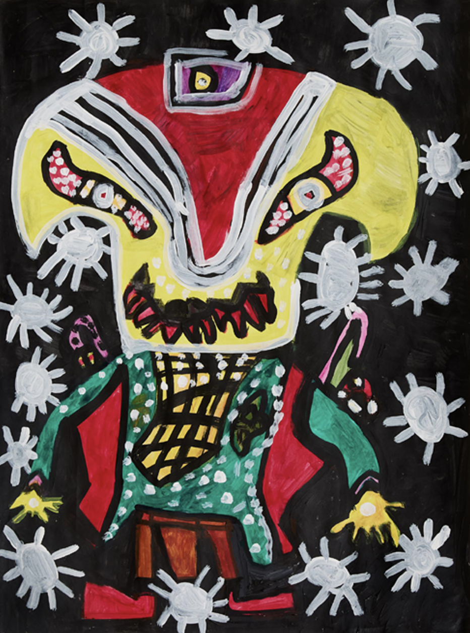 Vivid figural paintings take center stage in a parade of Wicked Timelords, Pet Werewolves, and Psycho Santas. These outrageous characters extend their paws and claws, beckoning you to join in their revelry. Rinsky’s slab-built ceramics imbue the space with a bodily immediacy that implies creatures from another dimension have already entered our world. Meanwhile, soft sculptures introduce a contrasting material language that speaks to the gentle actions of play and comfort. Collapsing the divide between observer and subject, Rinsky complements traditional modes of making with lifesized “face-in-the-hole” panels, inviting viewers to become participants in these fantastical scenes.