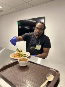 Angie Negrete, Director of NHF Arleta Recuperative Care, explains, “Our interim housing guests come from programs like the Los Angeles Homeless Authority housing queue, while our recuperative guests come from hospital and insurance partners and are with us for a shorter stay. For both groups, we focus on helping people get back on their feet and into permanent housing. In some cases, we’re also able to support family reunification.” At its current capacity, the center has over 100 guests who receive three meals a day. Mario Ledesma, Arleta’s Chef and Kitchen Supervisor, shares, “Preparing such a high volume of meals takes a consistent pace from a strong crew. We support the dietary and nutritional well-being of our residents and prepare fresh dishes that are lowsodium and nutrient-rich.”